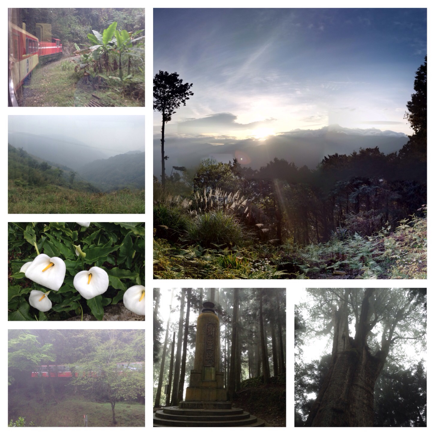 Heading north, we took a bus up to the Alishan Mountain Forest, home of Taiwan’s tallest mountains. It was cold and misty up there, but it made hiking around the old cypress forest kind of spooky and interesting. We found a tree that’s over 2300 years old! It was cherry blossom season, so lots- I mean hundreds- of mainland Chinese tourists were up there visiting for the day, but we spent the night up on the mountain, and after the day trip buses departed around 4 pm, the area quieted down. A beautiful sunset, when the clouds cleared up a bit and sank below the mountains, and a clear sunrise the next morning. By 10 am, over 150 tour buses had arrived- I counted- so we took the century-old, historic logging train down the mountain. A picturesque ride, as the red train wound down the mountains, through the green bamboo, cypress, and cedar tree forests.