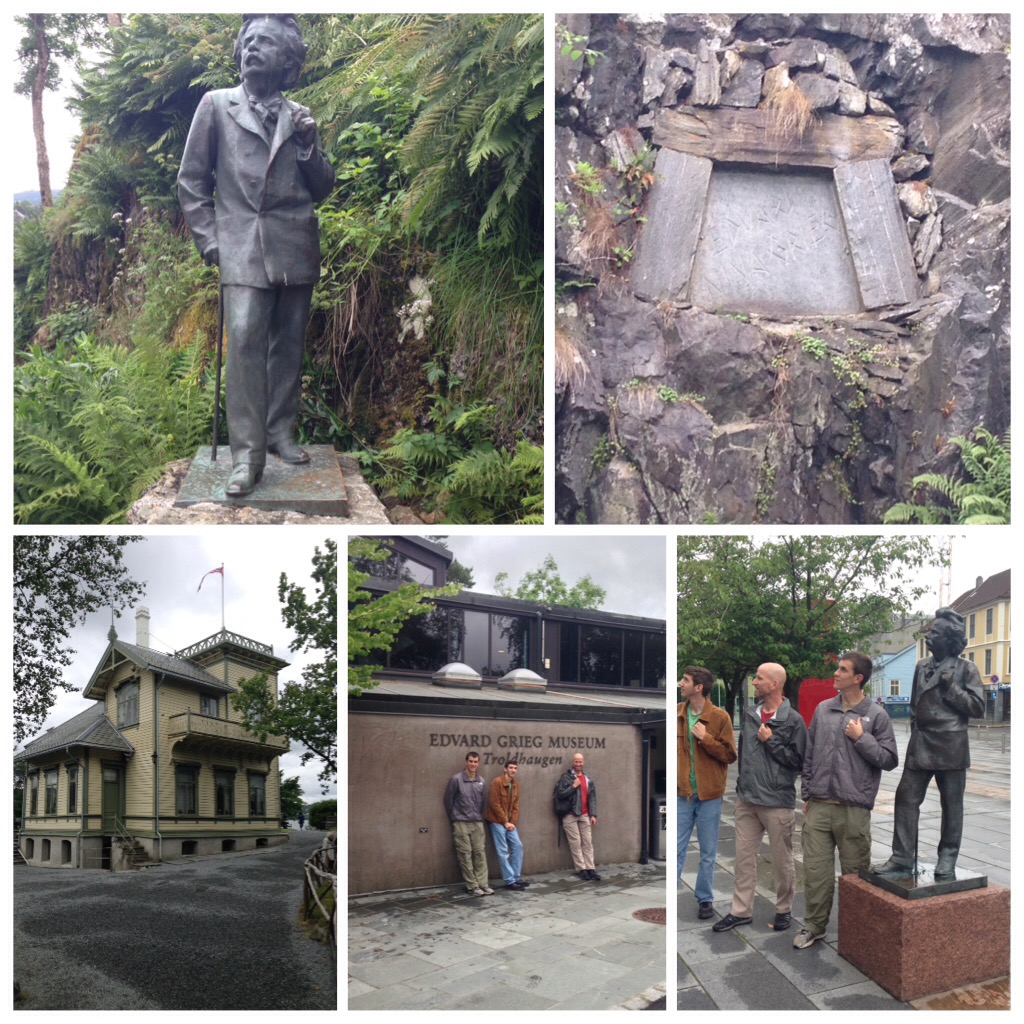 Yesterday, our last day, we visited the Edvard Grieg Troldhaugen (Troll Hill) estate. Chris is a Grieg and is distantly related, and in fact his dad had given us a family ring stamped with initials and dated 1872 to show the museum staff. At the museum the staff showed us a family tree, last updated in 1941, that had Chris’s father and aunt on it! The estate is quite pretty, consisting of a small museum, the composer’s house and a small hut by the lake he would use for work, the grave site of Edvard Grieg and his wife Nina, and a concert hall that looks out upon the lake. They have daily concerts there in the summer. After, we had enough time for giant kebabs for lunch and a quick trip to the Leprosy museum (they were closing in 15 minutes), before we put the kids on a bus to the airport, for their flight to Oslo and then home.  The pub near us had a live band playing and later a fun soccer crowd, so we sat outside and listened to the band play while we sipped hot chocolate.