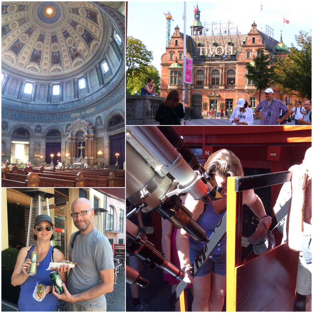 On Sunday we took a rather lengthy, but super informative, three hour walking tour that showed us the main bits of Copenhagen. Palaces, museums, statues, squares, Tivoli, etc. Afterwards we found the Little Mermaid statue of our own, entered the Marble Church, and climbed the Round Tower and looked at a solar flare using the telescope in the 400 year old observatory. Chris and I ate an early dinner in Nyhavn, and walked home via Christiana.