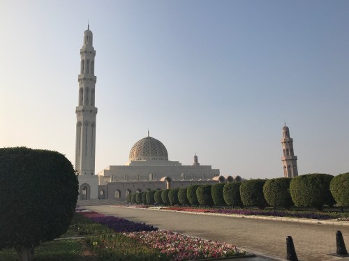 Our first two days in the city we stayed in the central area of Saeeb and visited the Grand Mosque. It’s open to visitors every day of the week except Friday, and it’s free to enter. People of all faiths can visit, and they provide abayas for women, although if you just wear loose trousers or a long skirt with long sleeves, that’s fine as well. You will need a scarf to cover your hair (ladies). The mosque itself, named after Sultan Qaboos who took power in 1970, is just beautiful. It is supposedly the 3rd largest mosque in the world and features the largest Swarovski crystal chandelier, weighing 9 tons, and the largest hand-made Iranian carpet, weighting 21 tons and taking 4 years to complete, with 600 women working on it. In addition, the mosque is beautifully adorned both inside and out, including a long portico displaying tiled friezes from 12 areas around the Islamic world. There is a library as well as an information center, and a separate prayer room for women. It’s open from 8-11 every morning to visitors, and there’s a Mwasalat stop out in front. I highly suggest visiting it if you are in Muscat.