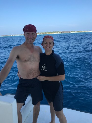 Chris and Deah, in between divesAside from diving- and eating- we pretty much just… lounged around. We watched dolphins swim by. We read books, and played card games. We walked around the whole island, which only takes about 40 minutes. We watched snorkelers and paddle boarders. We could take a boat to a nearby resort island but we didn’t feel like it. Basically, we just enjoyed the sun, the cool breeze, lots of fresh Coca Cola, and relaxed.