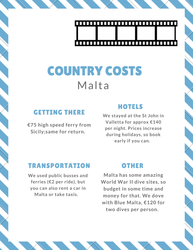 If you’re ready to come visit Malta and see these sights for yourself, it’s not difficult to get here. You can take a a high speed ferry from Sicily, or fly in using various airlines (RyanAir has a hub here so look for great deals). Once on the island, there is an excellent public bus network (each ride €2 but includes a 2 hour transfer window), as well as multiple daily ferries to the Three Cities, Gozo, and Comino. With 300 days of sunshine here, it gets quite warm in the summer, but the rest of the year can be quite nice.