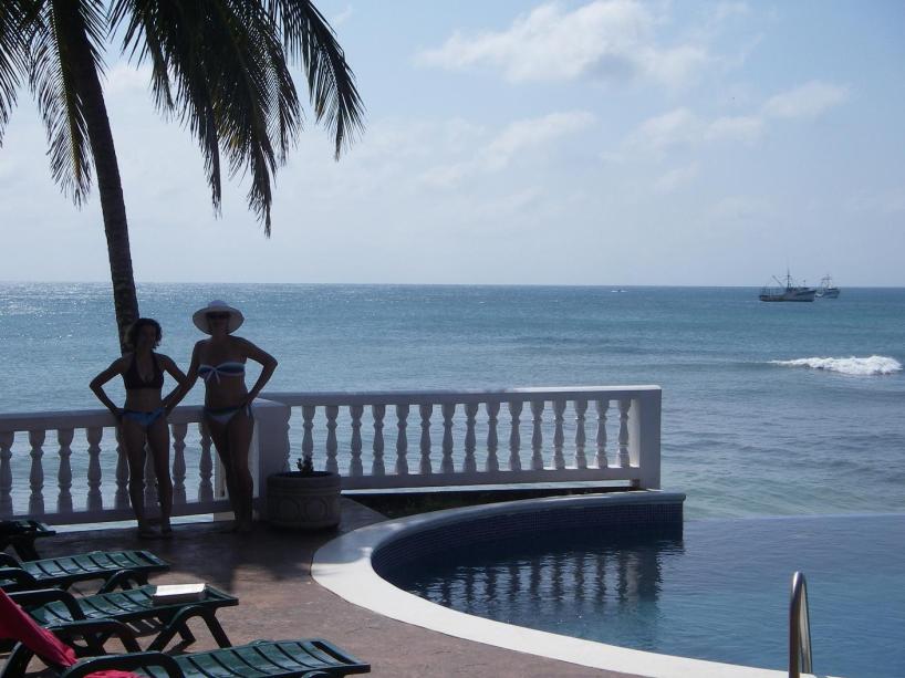We walked from our first hotel into the main town on the island, which was at the north end, and checked out the dive shop and the one restaurant in town. We changed hotels, and wound up on the east side of the island, at a hotel called Casa Canada. A fabulous little place, it had its own generator (thus, electricity!), a beautiful pool, a/c in the rooms, cable tv, and a great king size bed. The four of us, plus our pups Lucia and Consuela, were quite happy there. We hung there Friday and Saturday, and took little walks down to the south end of the island to check out the sandy beach there, and walks into town. Kathleen and I rented bicycles and pedaled around for a while. We tried snorkeling but the jellyfish got us, and I decided the pool and a chaise lounge was really all I needed.