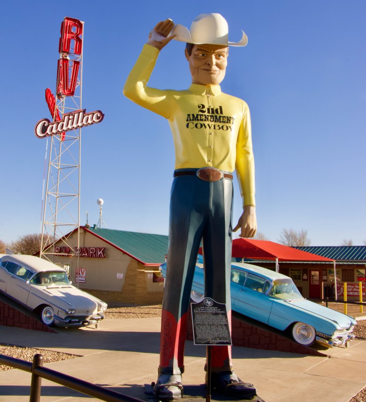Just like the 72 oz steak, everything else in Amarillo is big too. You can visit the 22′ tall “2nd Amendment Cowboy”, just down the road from Cadillac Ranch. An art project born of a strange union between some hippie artists in San Francisco and a billionaire from Texas, Cadillac Ranch consists of ten classic Cadillacs, buried nose-down in the Texas dirt. The art installation is free of charge to visit, and is open every day of the year. Littered with discarded half-empty cans of spray paint, visitors are welcome to add their own tag to any of the vehicle and photograph them to their hearts’ content.