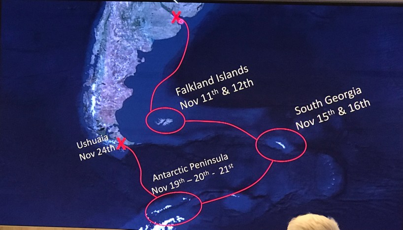 In between landings, on most ships, various expedition leaders and experts will give talks or lectures, which may be video-recorded and viewable from your stateroom. We had a lecture on the Falklands Conflict, photography workshops from Renato, tales of PolarAJ’s North Pole trek, and history lessons about Ernest Shackleton and other polar explorers. We also had Citizen Science opportunities to identify bird species, whales, seaweed, and clouds.